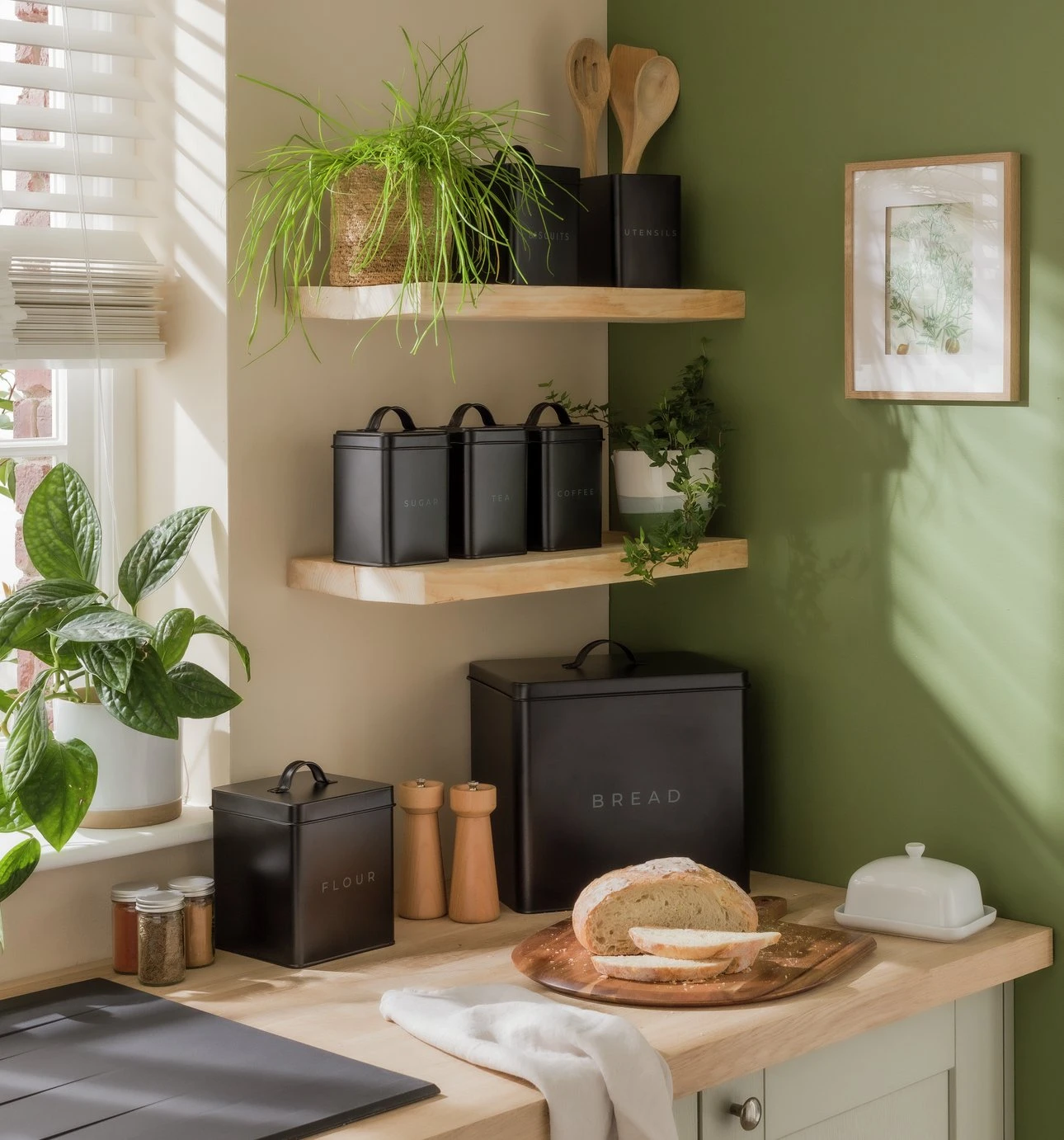 A place for everything. In matte black carbon steel, this storage set is just the thing to tidy up your kitchen while giving it a touch of designer. Keeps bread, flour and biscuits fresh and lasting for longer. And essentials like coffee, tea and sugar within easy reach. There’s a container for useful utensils and everything is labelled. Love that organised feeling.