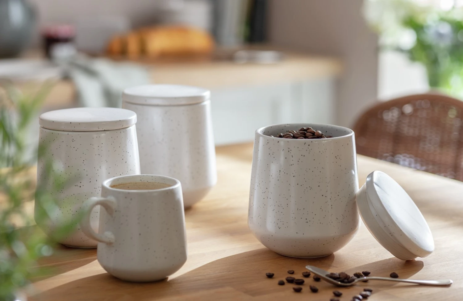 Simply essential. Store tea and coffee in this set of minimalist stoneware cannisters. Gently curved design lines and speckled detail on eggshell white creates a modern aesthetic. And the airtight seal on the lids keeps things fresh. An on-trend duo.