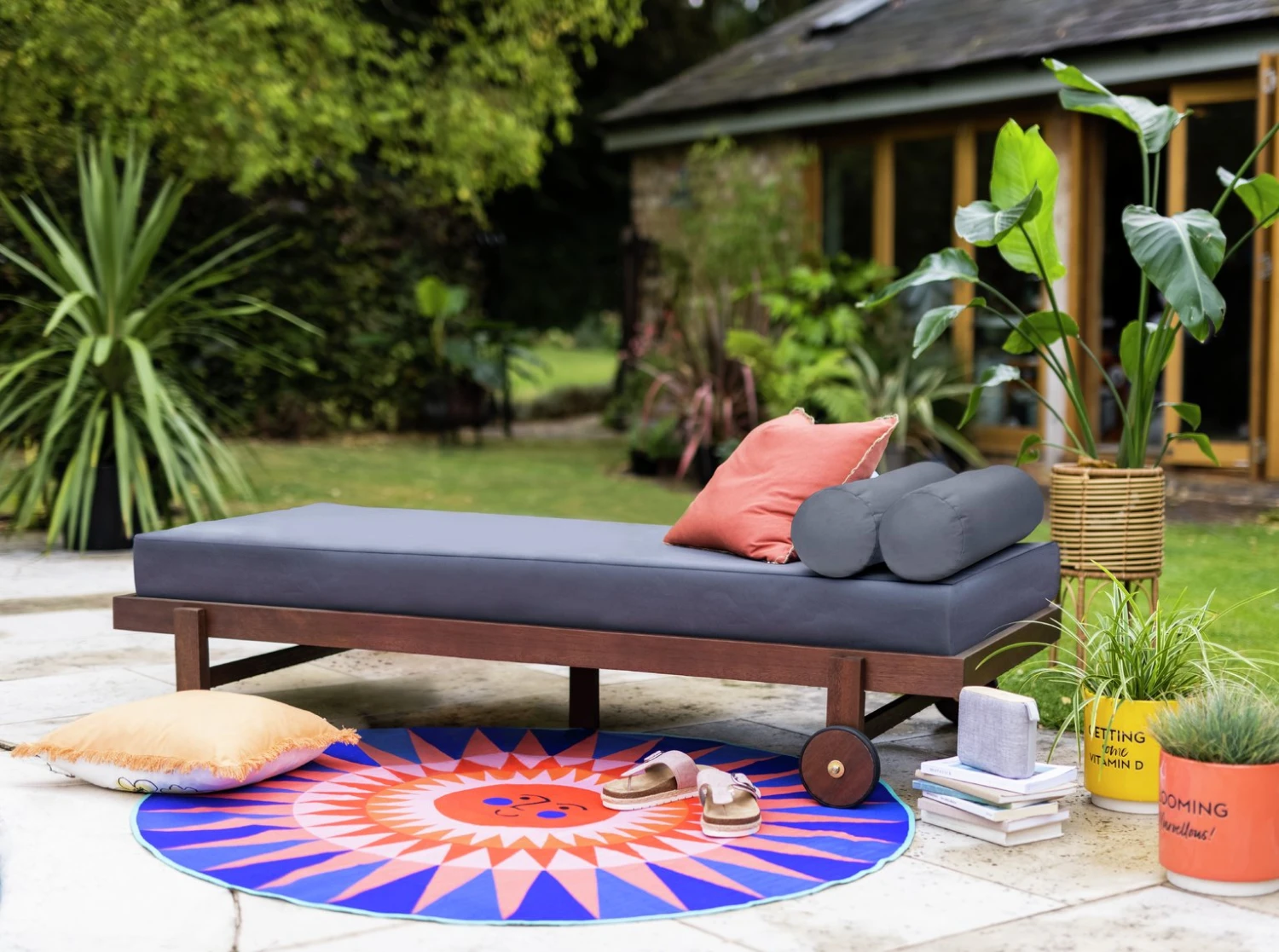 Check out our collection of garden friendly pillows, throws and rugs and add some bright pops of pink, blue and yellow to create a vibrant contrast.