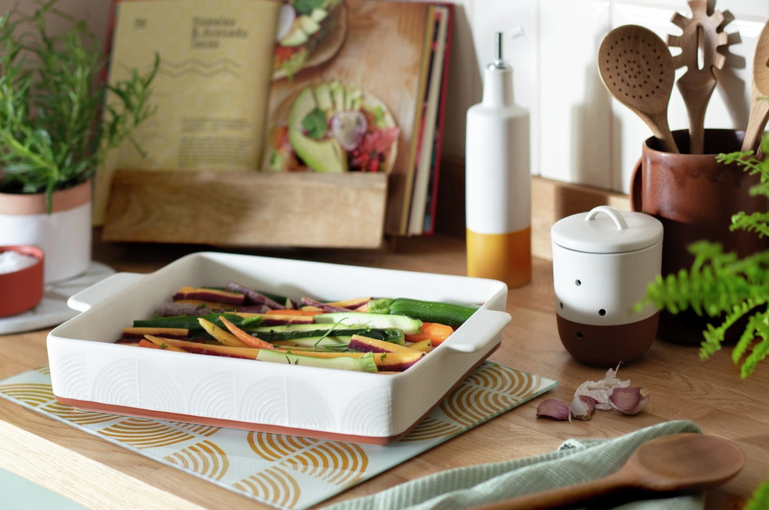 From lasagna to fruit crumbles, our large stoneware roaster is your go to dish. With a thick, white patterned glaze, natural terracotta base, and easy grip handles, it’s a real oven to table star.