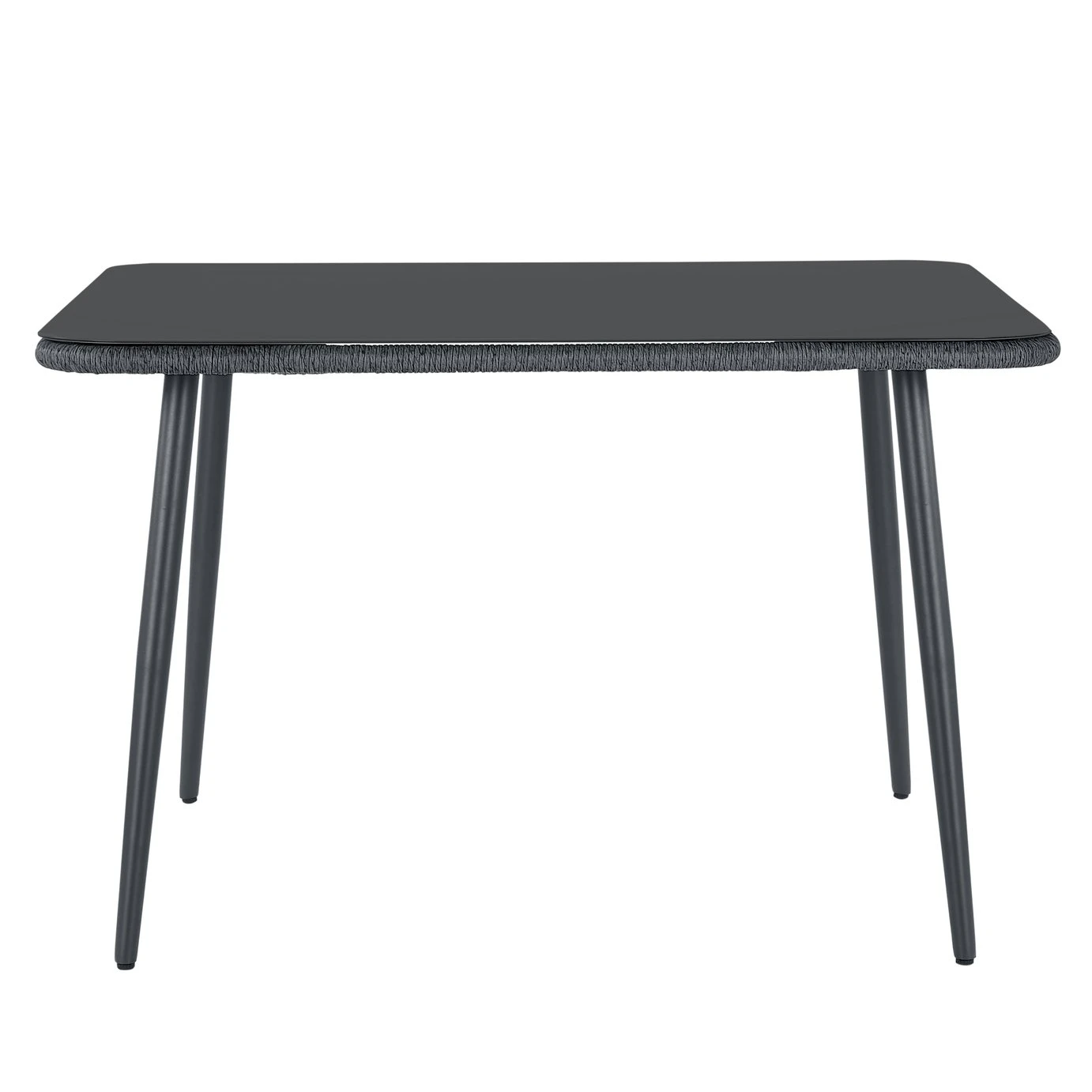 Get garden party ready with our 6-person dining set in jet black. Relax on the 6-seater corner sofa and pull up this pair of nifty stools. Lipped edges mean no slip-sliding around for seat pads. Serving up a feast? Gather round this smart, glass-topped table. Removable legs mean it’s simple to store, too. Rattan-effect rope and steel frames make each piece strong, lightweight and easy to move about. The 10 cool grey cushions add to the comfort factor. So, grab a glass of Pimms and settle in. Summer, we’re ready for you.