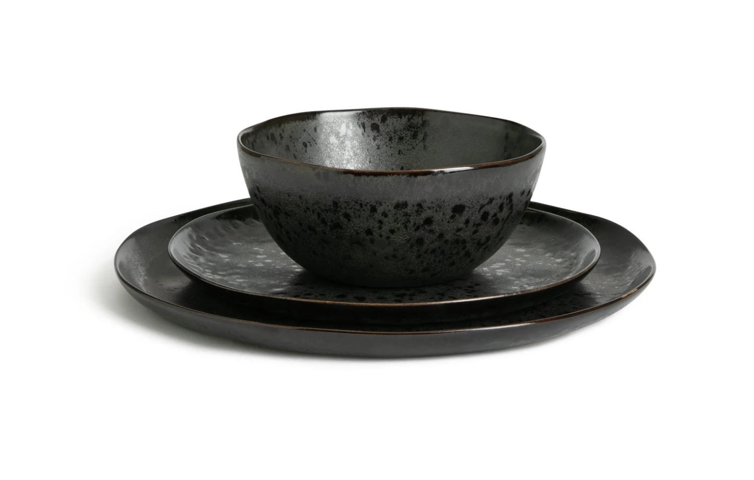 Dark and dramatic. Our stunning, black reactive glaze 12-piece dinner set is bold and beautiful. This stoneware collection includes 4 large plates, 4 side plates and 4 bowls, it’s ideal for everyday use or more formal affairs. Designed to display food at its best and create a bit of drama at dinner parties. Naturally undulating edges and a matte glaze give this tactile set a hand-made feel. Microwave safe, so heat and take straight to the table. Then stack in the dishwasher and you’re done. Delicious.
