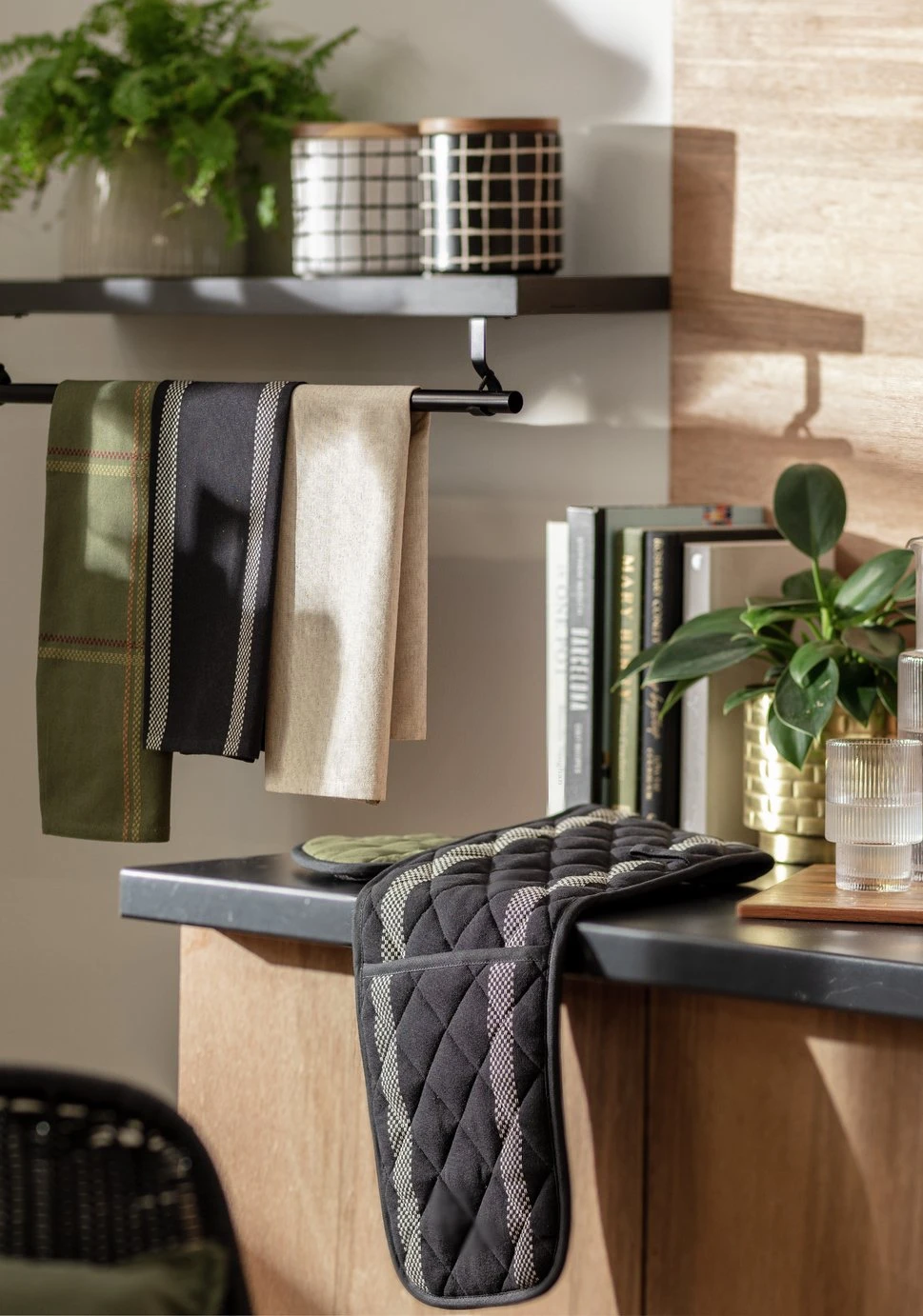 Take 3 designer woven cotton tea towels, add a matching double oven glove and what have you got? A smart 4-piece textile set that’d be welcome in any kitchen. An exclusive Habitat design, in black, cream and dark green.